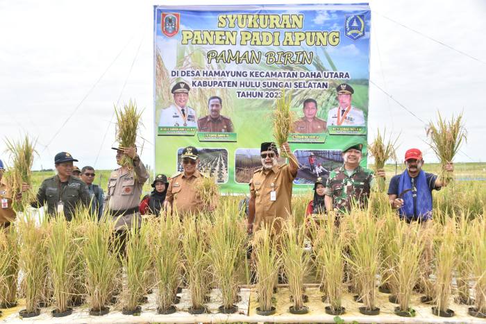 SuarIndonesia – Gubernur Kalimantan Selatan (Kalsel), Sahbirin Noor atau Paman Birin menghadiri syukuran dan panen bersama para petani budidaya padi apung di Desa Hamayung Kecamatan Daha Utara, Kabupaten Hulu Sungai Selatan, Kandangan, Selasa (4/4/2023).