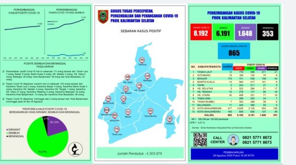 Pada Sabtu (29/8/2020) tambahan kasus baru mencapai 111 orang. Banjarmasin dan Balangan penyumbang terbesar pertama dan ke dua. Banjarmasin menyumbang 38 orang dan Balangan 26 orang.