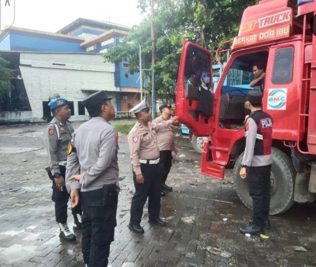 Petugas Patroli Polsek KPL Banjarmasin memberikan himbauan kamtibmas kepada para sopir truk yang akan berangkat menuju Pelabuhan Tanjung Perak Surabaya.