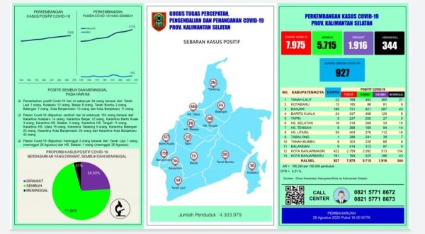 Hingga saat ini covid di Kalsel berjumlah 7.975 terdiri dari 5.715 sembuh, 1.916 dalam perawatan, dan 344 meninggal dunia.