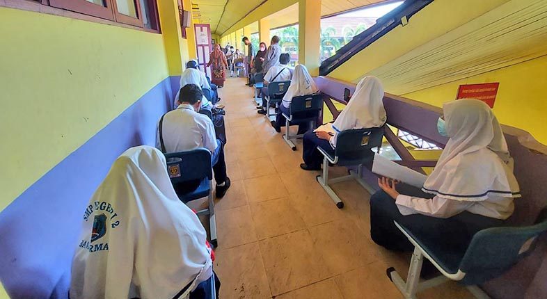 Seperti yang terlihat di SMPN 2 Banjarmasin, vaksinasi diikuti antusias oleh siswa. Dengan mengenakan seragam sekolah, para siswa terlihat semangat menunggu giliran untuk mendapatkan vaksin.