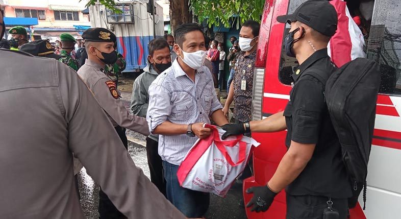 Ratusan warga pasar yang kesehariannya bekerja sebagai buruh lepas maupun penarik becak mengantre untuk mendapatkan bantuan dari Presiden Indonesia ini.