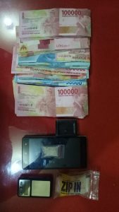 Satu buah timbangan digital, satu buah Handphone berisikan pesanan Narkoba, uang sebesar Rp 4.505.000 dan, satu buah bundel plastik klip.