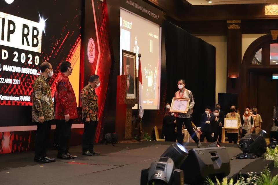 Penyerahannya penghargaan hasil evaluasi akuntabilitas kinerja dan pelaksanaan reformasi birokrasi instansi pemerintah provinsi kabupaten kota tahun 2020 tersebut, dilakukan langsung Menteri Pendayagunaan Aparatur Negara dan Reformasi Birokrasi (PANRB), Tjahjo Kumolo, kepada Kepala Badan Perencanaan Penelitian dan Pengembangan Daerah (Barenlitbangda) Kota Banjarmasin, Sugito, di Jakarta, Kamis (22/04/2021).