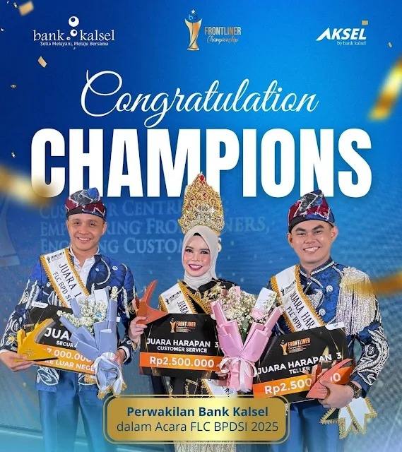 Tiga perwakilan Bank Kalsel sukses membawa pulang gelar juara, di antaranya Ahmad Rifandi-l yang meraih Juara 1 kategori Security, Ibnu Aulia Rahman dengan capaian Juara Harapan 3 Teller, serta Nurunnisa yang juga menyabet Juara Harapan 3 Customer Service.