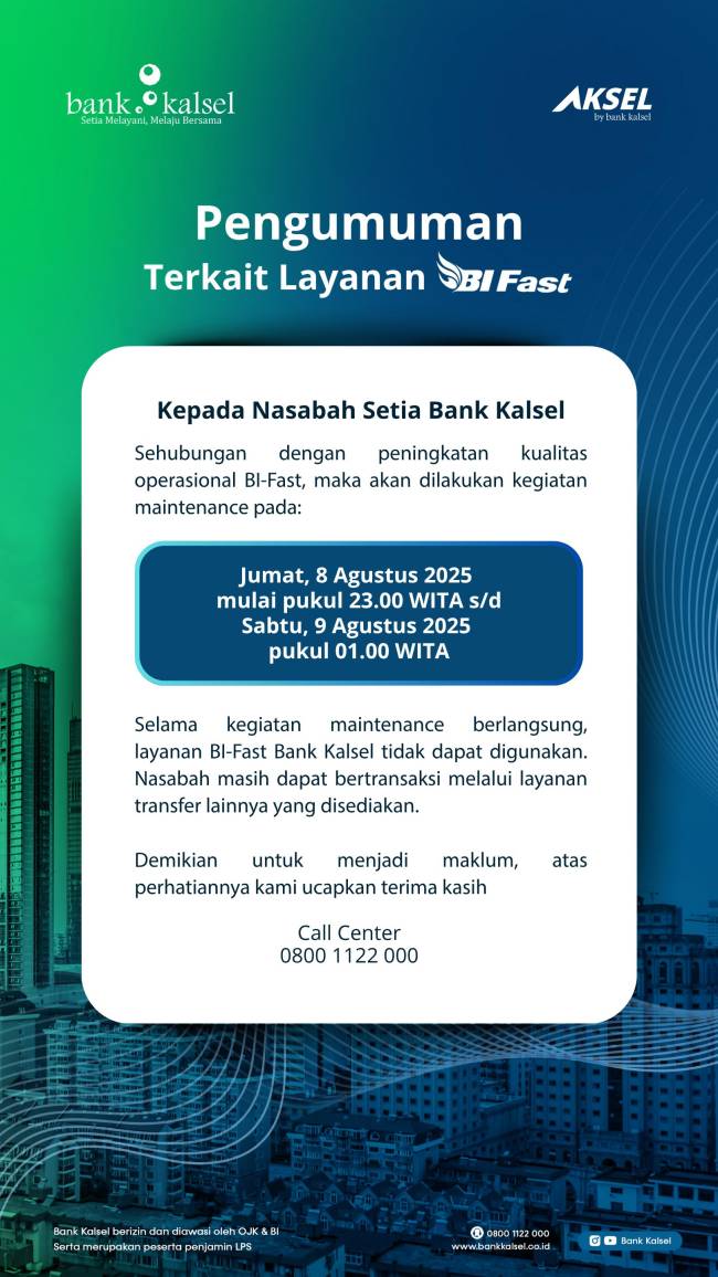 Nasabah yang memerlukan informasi lebih lanjut dapat menghubungi Call Center Bank Kalsel di nomor 0800 1122 000.