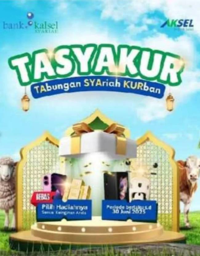SuarIndonesia – Bagi yang ingin menyisihkan sebagian hasil setiap bulan sambil meraih pahala ibadah kurban? Sekarang, impian itu bisa terwujud melalui program TASYAKUR (Tabungan Syariah Kurban) dari Bank Kalsel Syariah!.