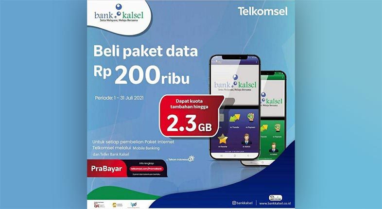 Terbaru Bank Kalsel dan Telkomsel menawarkan promo paket data Rp200.000 dan bisa langsung mendapatkan tambahan kuota hingga 2,3 GB. Promo ini hanya berlaku mulai tanggal 1 – 31 Juli 2021.