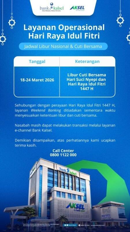 Meski demikian, nasabah tetap dapat melakukan berbagai transaksi perbankan melalui layanan elektronik atau e-channel Bank Kalsel, seperti ATM, mobile banking, dan fasilitas digital lainnya.