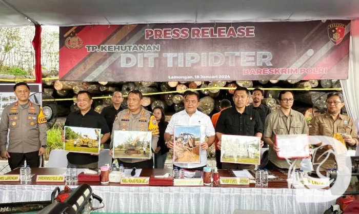 Konferensi Pers Bareskrim Polri terkait perkara dugaan tindak pidana illegal loging (Perkara dugaan Tindak Pidana Setiap orang yang dengan sengaja memanen dan memungut hasil hutan di dalam hutan tanpa memiliki hak atau persetujuan dari Pejabat yang berwenang) digelar di PT Kayan Wood Industries Jl Babat – Gresik Desa Paji Kecamatan Pucuk Kabupaten Lamongan , Kamis (18/1/2024).