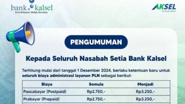 SuarIndonesia – Ini kebijakan baru bagi seluruh nasabah setia Bank Kalsel, terhitung mulai dari tanggal 1 Desember 2024, berlaku ketentuan baru untuk seluruh biaya administrasi layanan PLN.