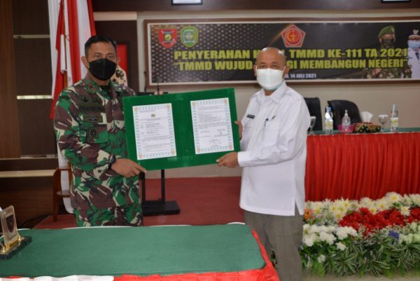 TNI Manunggal Membangun Desa (TMMD) ke-111 Kodim 1010/Tapin TA 2021, ditutup dengan penyerahan hasil TMMD dari Danrem 101/Antasari kepada Bupati Tapin yang diwakili Sekda, H. Masyraniansyah.