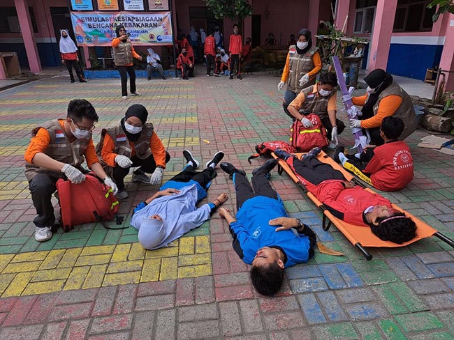 Di sisi lain, guru beserta siswa yang tampak terlatih, bertindak cepat. Ada yang memadamkan api dengan peralatan yang tersedia. Lalu, ada pula yang membantu evakuasi, hingga mengobati korban luka.