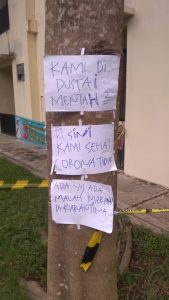 Tulisan ke dua berbunyi “kami didustai mentah-mentah, di sini kami sehat corona tidak ada, yang ada malah merana dikarantina”.