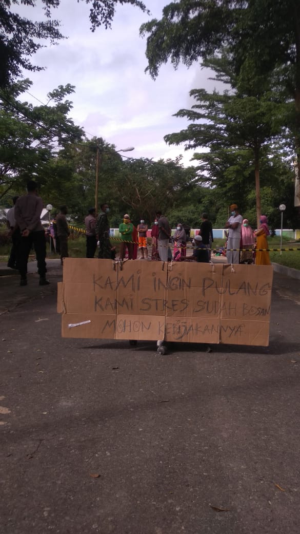 Foto yang tersebut yang pertama bertuliskan “kami ingin pulang , kami stres sudah bosa, mohon kebijaksanaan”.