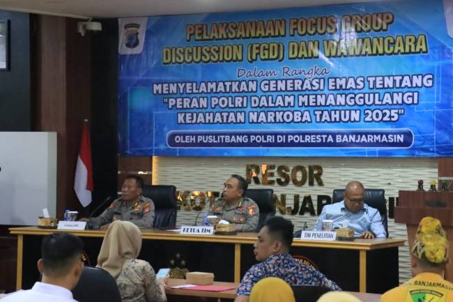 SuarIndonesia – Bersinergi selamatkan generasi emas dari bahaya narkoba, Pusat Penelitian dan Pengembangan (Puslitbang) Polri menggelar Focus Group Discussion (FGD) di Polresta Banjarmasin, Selasa(29/7/2025).
