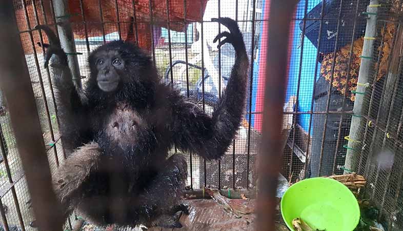 SuarIndonesia — Seekor Owa-owa betina yang berhasil dievakuasi oleh petugas Dinas Pemadam Kebakaran (Damkar) dan Penyelamatan Kota Banjarmasin dari permukiman penduduk.