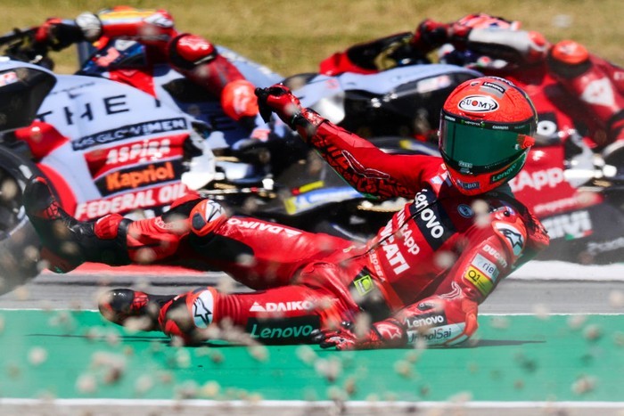 SuarIndonesia – Sprint Race MotoGP Catalunya 2024 berlangsung brutal. Tiga rider jatuh saat sedang memimpin termasuk Pecco, sementara Marc Marquez naik podium dari posisi ke-14.