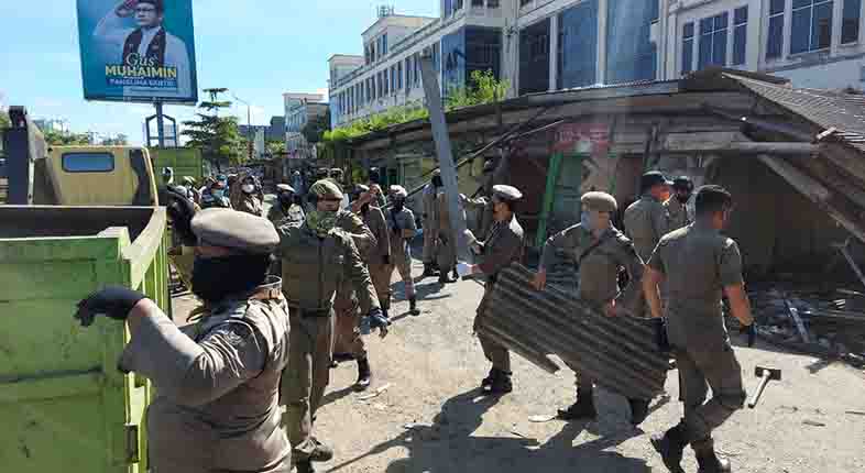 SuarIndonesia — Pembersihan sisa bongkaran puluhan bangunan di depan Banjarmasin Trade Center (BTC) dilaksanakan petugas Satpol PP Banjarmasin Minggu, (07/11/2021).