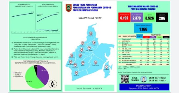 SuarIndonesia – Secara keseluruhan kasus covid-19 di Kalsel berjumlah 6.192 terdiri dari 2.370 dalam perawatan, 3.526 sembuh, dan 296 meninggal.