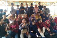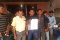 PERLIHATKAN BUKTI – Samlan (baju kuning gading nomor dua dari kiri) didampingi sejumlah mandor serta buruh Koperasi TKBMt Samudera Nusantara, perlihatkan bukti yang akan…