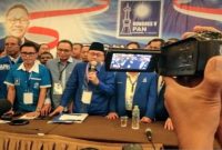 Zulkifli Hasan (tengah) saat memberikan pernyataan setelah terpilih kembali sebagai ketua umum DPP PAN periode 2020-2025. Hasil penghitungan akhir Zulhas mendapat 331 suara dari…