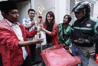 Sekjen PSI Raja Juli Antoni dan Ketua DPP PSI Tsamara Amany memberikan piala dan piagam kebohongan award yang akan dikirim menggunakan jasa ojek kepada…