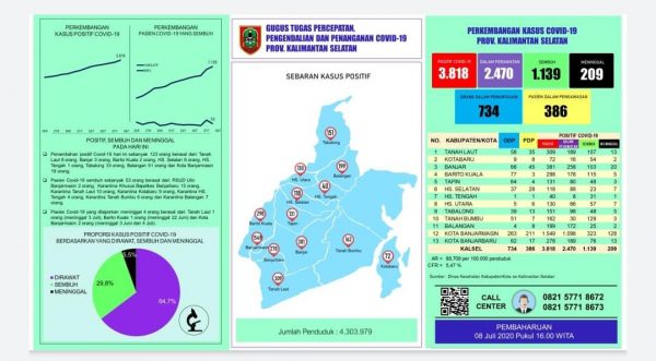 Keseluruhan kasus covid di Kalsel berjumlah 3.818 terdiri dari 2.470 dalam perawatan, 1.139 sembuh, dan 209 meninggal dunia.
