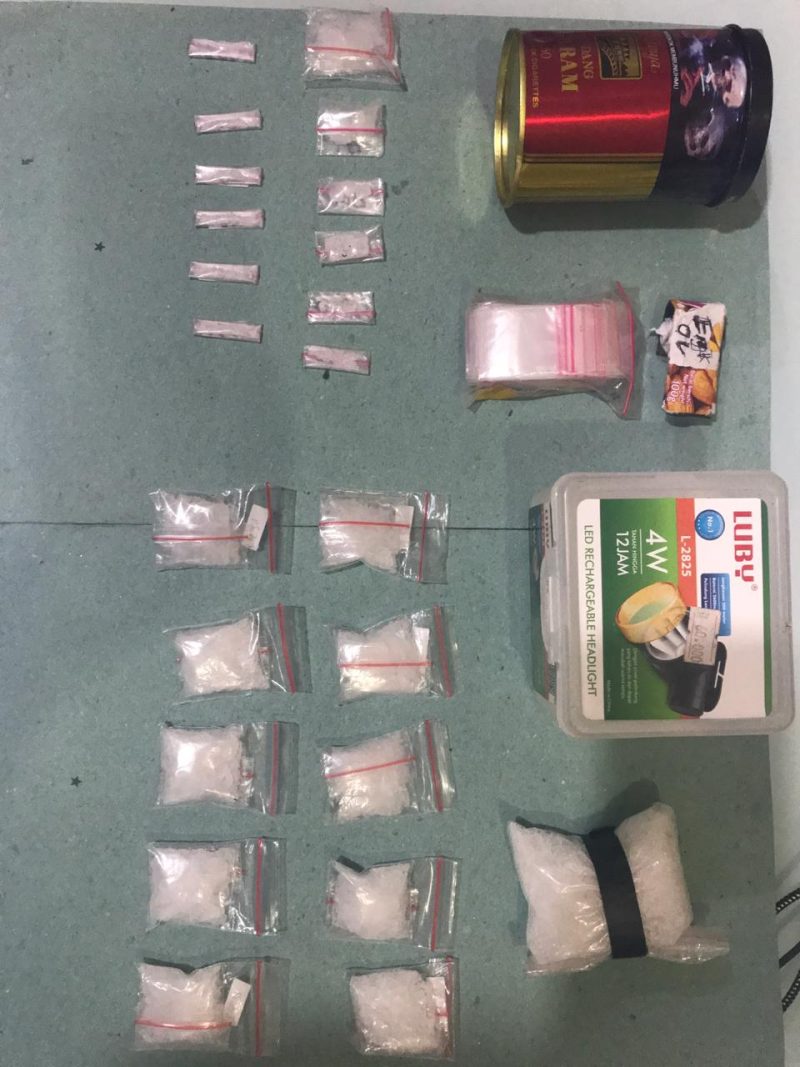 Kepolisian menyita barang bukti sebuah kotak plastik senter berisi 11 paket sabu seberat112,5 gram, kotak rokok, yang berisi 11 paket sabu seberat 4,39 gram, bungkus coklat berisi 1 paket sabu 2,83 gram.