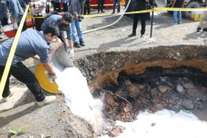 Pemusnahan sabu secara simbolis dengan dituang dalam drum yang sudah diisi air dan deterjen kemudian dibuang ke lubang yang disiapkan. (ZI)