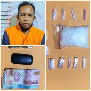 Diamankan tersangka SI alias Cacing (48) warga HKSN Komplek Dasamaya dengan barang bukti 13 paket sabu berat bersih 44,17 gram dan sejumklah barang bukti lainnya.