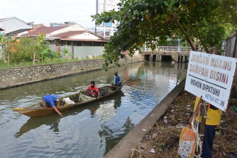 Sedari pagi, sungai yang terhubung ke Sungai Miai itu dibersihkan warga sekitar. Sambil menggunakan perahu, sampah-sampah yang ada di sungai diangkat kedarat.