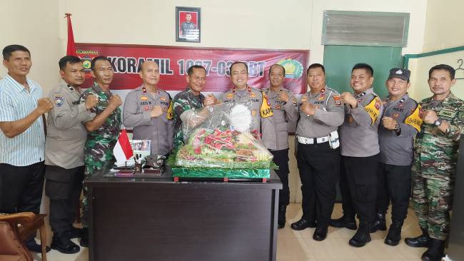 SuarIndonesia -Dua Kapolsek memberi kejutan ke Markas Koramil 1007-03 Banjarmasin Barat/ Tengah, dalam rangka Hari Ulang Tahun Tentara Nasional Indonesia (HUT TNI) ke-79 pada Sabtu (5/10/2024).