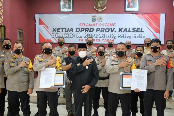 SuarIndonesia – Ketua DPRD Provinsi Kalimantan Selatan, Dr. (HC) H. Supian HK, S.H., M.H., memberikan penghargaan kepada Polres kabupaten Tapin dan Kabupaten Hulu Sungai Selatan (HSS), Jum’at (9/7/2021).