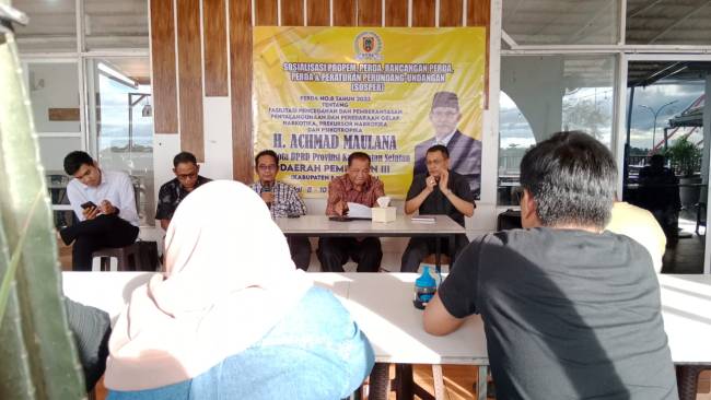 SuarIndonesia – Anggota DPRD Kalsel, H Achmad Maulana sosialisasi peraturan (sosper) Perda Kalsel Nomor 8 Tahun 2023 tentang Fasilitas Pencegahan dan Pemberantasan Penyalahgunaan dan Peredaran Gelap Narkotika, Prekursor Narkotika dan Psikotropika, pada Senin (10/3/2025).
