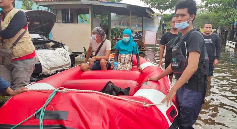 Pasalnya, lingkungan tempat warga mengungsi sendiri dikepung air dengan kedalaman hingga menyentuh paha orang dewasa, sehingga ibu hamil yang bernama Jubidah ini harus diangkut dengan menggunakan perahu karet.