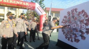 SuarIndonesia – Gambar Covid-19 dicoblos atau ditusuk Wakapolda Kalsel, Brigjen Pol Aneka Pristafuddin, sebagai tanda untuk menuntaskan penyebaran virus Corona.