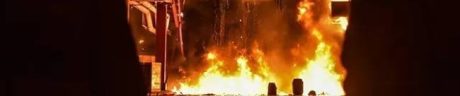 Dari keterangan, aksi, percikan api muncul dari bagian belakang bangunan dan bagian dalam bangunan.