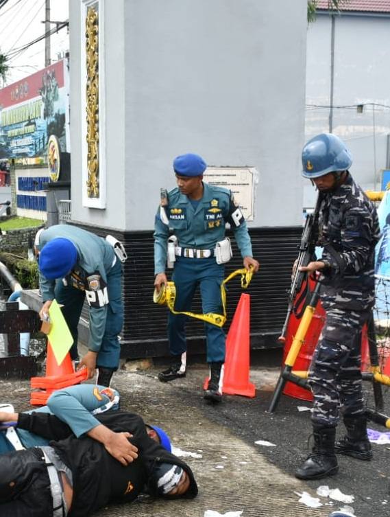 Pada kegiatan khusus simulasi peran Pertahanan Pangkalan (Hanlan), Lanal Banjarmasin bersinergi dengan Tim Jibom Gegana Satbrimob Polda Kalsel dan PMK Kota Banjarmasin.