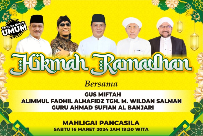 “Dalam suasana bulan puasa ini, Ulun mengundang warga Banua untuk mengikuti tausiah bersama Gus Miftah dalam Hikmah Ramadhan pada Sabtu malam di Mahligai Pancasila Banjarmasin,” sampai Paman Birin.