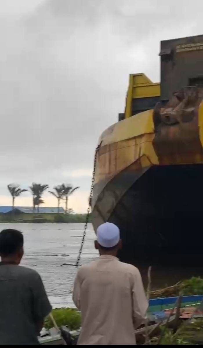 SuarIndonesia -Histeris warga Desa Keladan Kecamatan Candi Laras Utara, Kabupaten Tapin, Provinsi Kalsel lantaran kapal tongkang hancurkan puluhan rumah dan alat transportasi sungai.