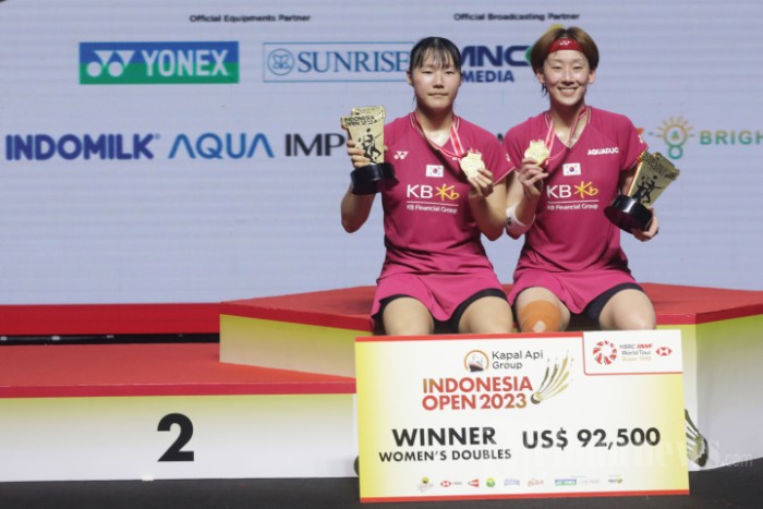 Ganda putri Korea Selatan, Baek Ha Na/Lee So Hee berfoto usai penyerahan medali dalam babak final Kapal Api Group Indonesia Open 2023 di Istora Senayan, Jakarta, Minggu (18/6/2023). [TribunNews]Sebab tiga nomor lainnya di Indonesia Open 2024 bisa dimenangkan China lagi. Chen Yu Fei menjadi juara di tunggal putri usai mengatasi An Se-young 21-14, 14-21, 21-18.