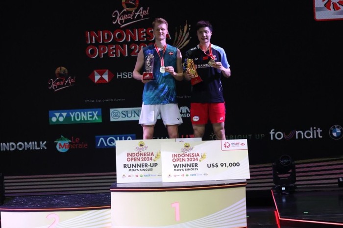 Shi Yu Qi menyabet titel juara Indonesia Open 2024 di nomor tunggal putra. [PBSI]Sementara tunggal putra dimenangkan Shi Yu Qi, yang mengalahkan Anders Antonsen 21-9, 12-21, 21-14. Terakhir, ganda putra dimenangkan Liang Wei Keng/Wang Chang, yang mengalahkan pasangan Malaysia Man Wei Chong/Kai Wun Tee 21-19, 16-21, 12-21.