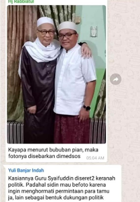 Para ibu tak rela Guru Syaifuddin ditarik ke ranah politik. Foto itu muncul di WAG Majelis Taklim Bani Ismail diposting oleh Hj Rabbiatul dengan kalimat, “Kayapa menurut bubuhan pian, maka fotonya disebarkan di medsos?”