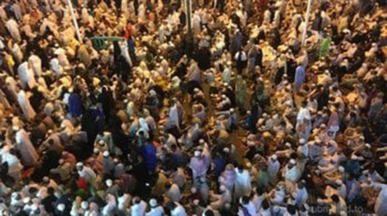 Jamaah umat Islam memenuhi seluruh jalanan di sekitar Masjidil Haram. Mereka akan melaksanakan salat Ied Idul Fitri yang jatuh pada hari ini, Selasa 4 Juni 2019.(detik.com)