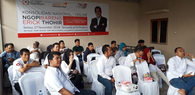 Suarindonesia – Jaringan Matahari Kalimantan Selatan mengikuti kegiatan konsolidasi nasional online bersama Ketua TKN Paslon Capres dan Cawapres 01 Joko Widodo dan Ma’ruf Amin yang tidak lain adalah Erick Thohir, Selasa (27/11/2018).