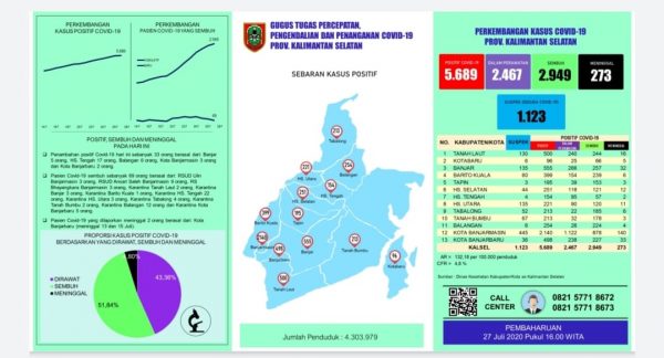 SuarIndonesia – Senin (27/7) kasus baru berjumlah 33 orang, sehingga total positif di Kalsel berjumlah 5.689. Senin (27/7/2020.