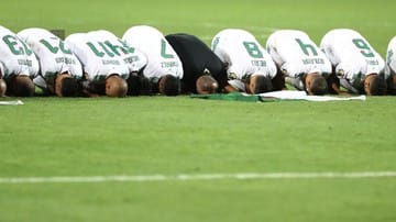 Para pemain timnas Aljazair dan pelatih melakukan sujud syukur atas kemenangan mereka sebagai juara Piala Afrika 2019. (REUTERS/Suhaib Salem)
