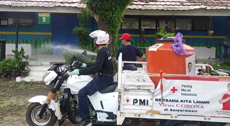 Penyemprotan disenfektan dengan menggunakan kendaraan roda dua.(Foto/Dok.SuarIndonesia)