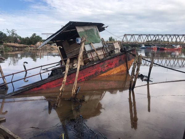 SuarIndonesia -Sebuah kapal pengangkut oli terbalik, dan cemari Sungai Alalak Utara, Banjarmasin Utara, Provinsi Kalimantan Selatan.